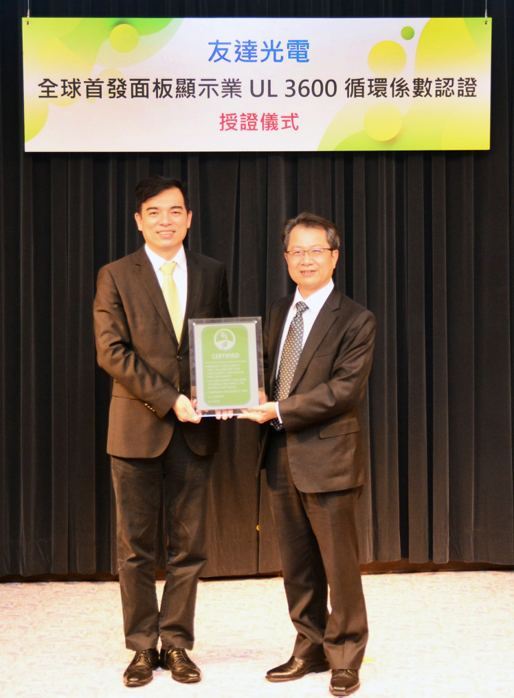 友達取得全球首張面板業(yè) UL 3600 循環(huán)係數(shù)認(rèn)證,由UL全球副總裁暨臺灣總經(jīng)理陳宗弘 (右)、友達總經(jīng)理暨營運長柯富仁 (左) 進行授證儀式。 |