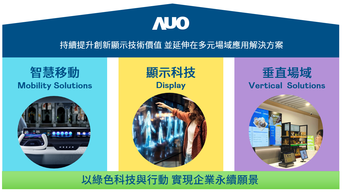 友達專精面板研發(fā)與製造,開發(fā)高值化及差異化產(chǎn)品應用,以豐沛的研發(fā)能量與創(chuàng)新技術穩(wěn)居業(yè)界領先地位,並以深厚的顯示技術為核心,結合AIoT致力成為各場域的解決方案商。友達光電積極推動雙軸轉(zhuǎn)型,以顯示科技、智慧移動、垂直場域三大永續(xù)營運支柱,持續(xù)提升創(chuàng)新顯示技術價值,延伸布局多元場域應用解決方案。我們整合軟硬體、雲(yún)端與服務平臺,提供一站式服務,以滿足不同場域的需求。我們期望透過合作、互補、共創(chuàng)的模式與各界夥伴共築智慧物聯(lián)網(wǎng)生態(tài)圈,引領實現(xiàn)未來智慧生活。